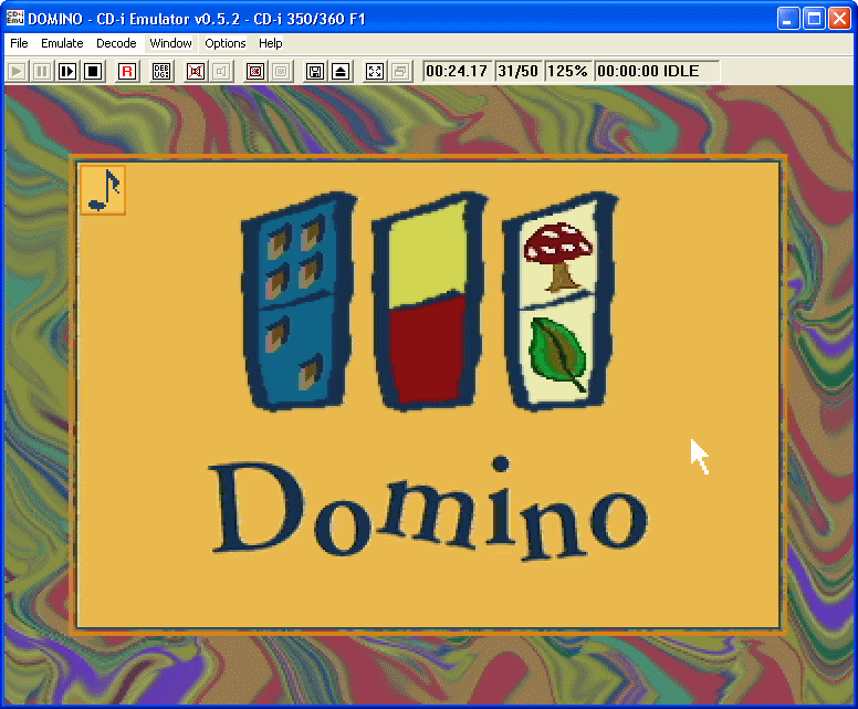 CD-i Emulator Compatibility: This section covers crucial details concerning performance of this specific game under emulation through CD-i Emulator. It will state the CD-i Player Rom used during the test, what version of CD-i Emulator was used, which program the Disc Image was created from, specifications of the test PC and also provide screenshots of the emulator in action. Also included is an account of the test and most importantly if the game is playable through CD-i Emulator. Rather than an exhaustive list of tests with various ROMS and different PC rigs it's hoped that this section gives some insight into the progress of CD-i Emulator. For the most recent updates to CD-i Emulator and compatibility it's suggested you visit the CD-i Emulator Homepage.