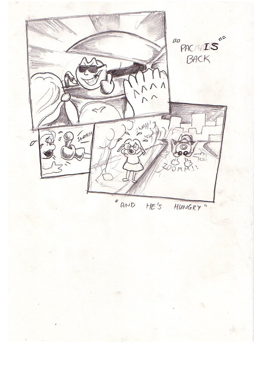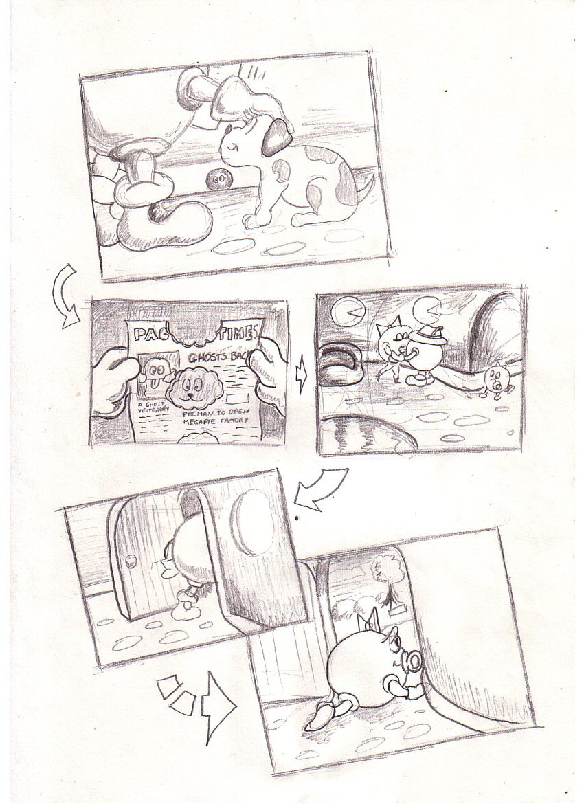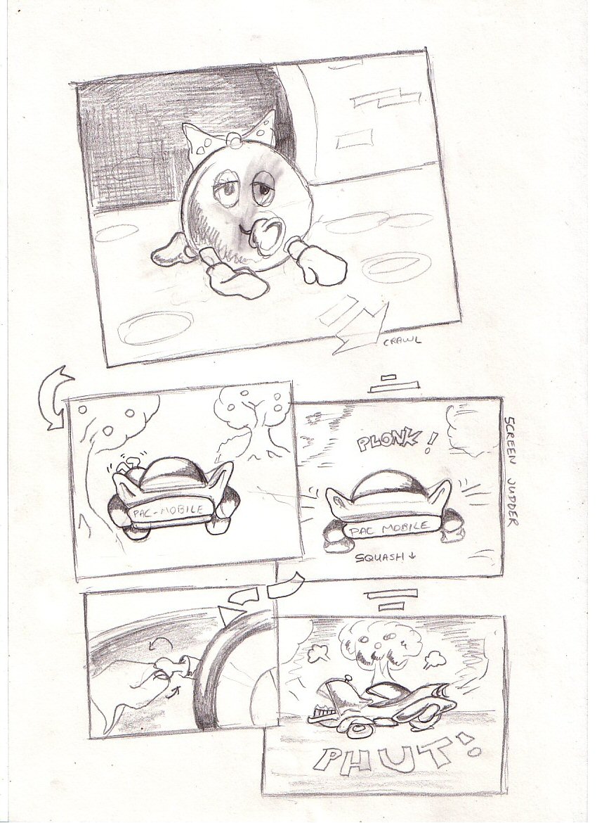 Without a doubt it was the introductory animation to Lemmings that put Johnny Wood on the map for his creative playful approach to game design bringing an extra incentive to the CD-i version of this multi-platform franchise. Given exclusive access to the design documents for the CD-i conversion of Pac-Panic we can reveal that the same treatment was planned for this game. Stating that amongst other enhancements the CD-i conversion would have a 60 second RL7 animation introducing the game. It's estimated that this would take 2 weeks to implement and in a business where time was money the powers that be decided to cut this feature. Fortunately for us a storyboard of this proposed introduction was sketched by Johnny complete with a rough plot to promote the idea as follows...