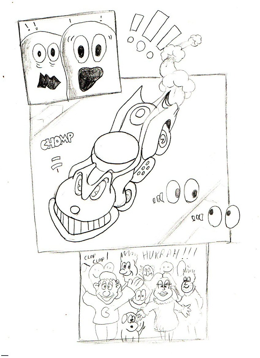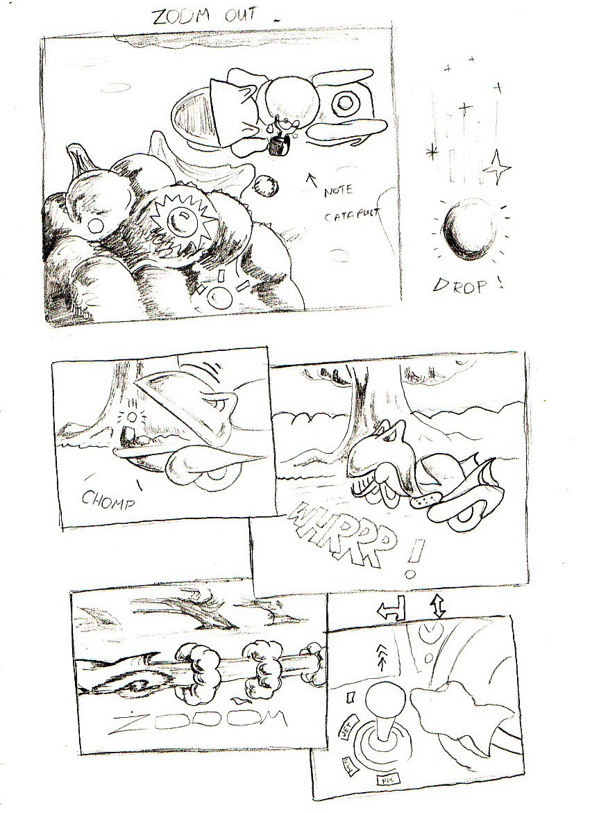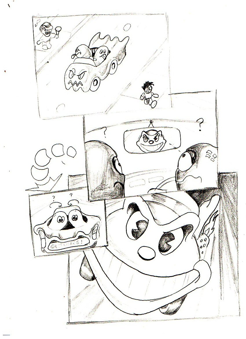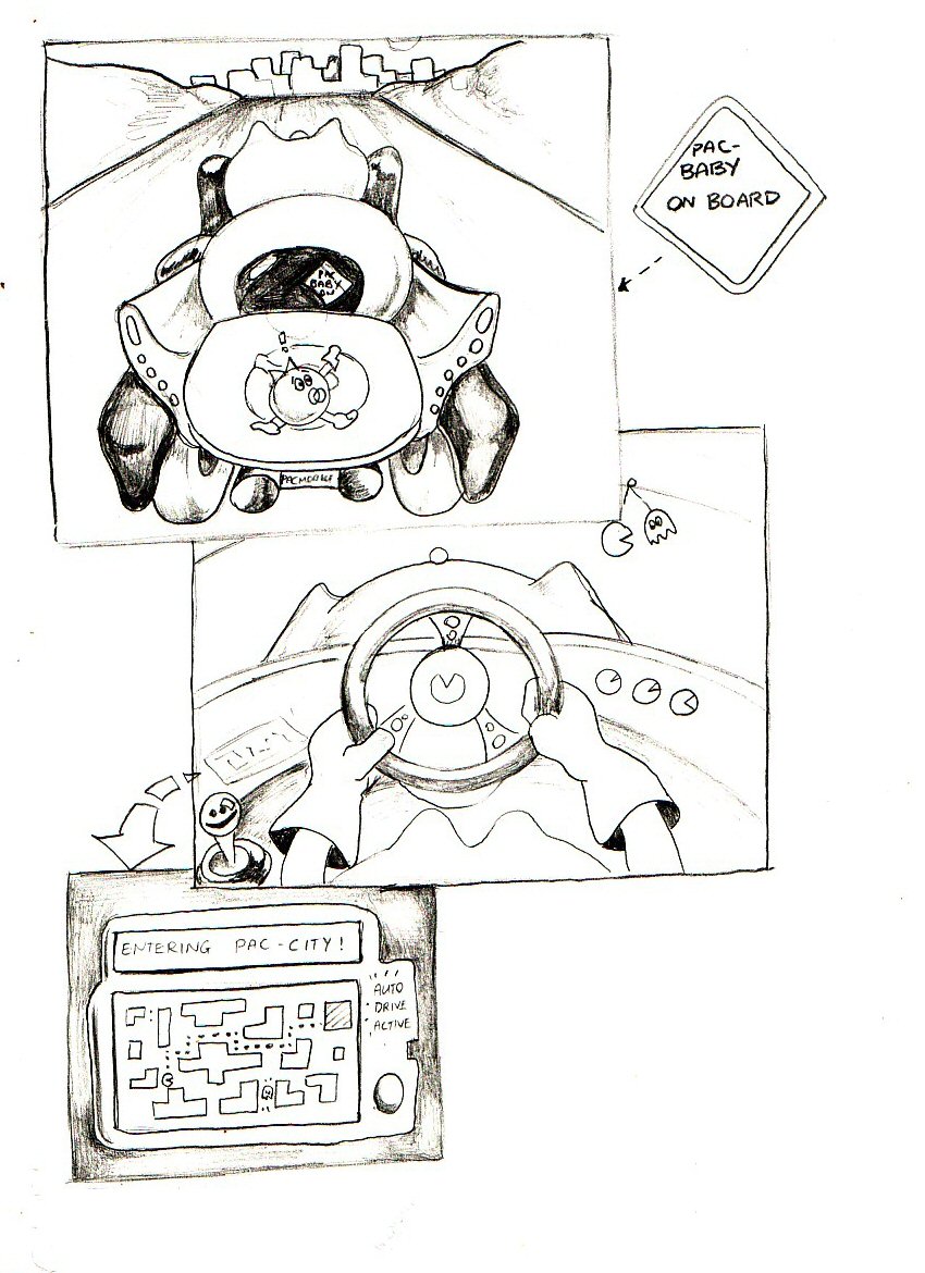 Without a doubt it was the introductory animation to Lemmings that put Johnny Wood on the map for his creative playful approach to game design bringing an extra incentive to the CD-i version of this multi-platform franchise. Given exclusive access to the design documents for the CD-i conversion of Pac-Panic we can reveal that the same treatment was planned for this game. Stating that amongst other enhancements the CD-i conversion would have a 60 second RL7 animation introducing the game. It's estimated that this would take 2 weeks to implement and in a business where time was money the powers that be decided to cut this feature. Fortunately for us a storyboard of this proposed introduction was sketched by Johnny complete with a rough plot to promote the idea as follows...